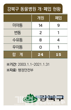 행정안전부에 따르면, 2020년 1월 31일 현재 강북구의 동물병원은 39개소이며, 그 중 38%(15개소)가 폐업한 것으로 나타났다.
