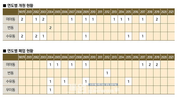 또한 강북구는 다른 지역에 비해서 인수 개원이나 지역 내 이전 개원이 드물며, 개원 기간도 긴 편이다.