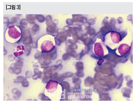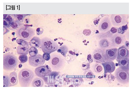 Round cell tumors는 세포가 둥글거나 타원형으로 분리되어 있는 특징이 있다.Histiocytoma, histiocytic sarcoma, lymphoma, mast cell tumors, extramedullary plasmacytoma, melanoma, TVT 등이 있다[그림 3].