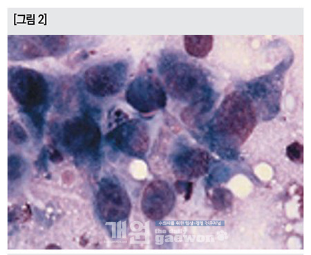 적혈구대소구부동증(anisocytosis), 핵부동(anisokaryosis), 높은 핵 대 세포질(N/C) 비율, 다핵, 비대및 다중의 핵소체, 유사분열 등으로 양성과 악성 세포를 구별한다[그림 1].