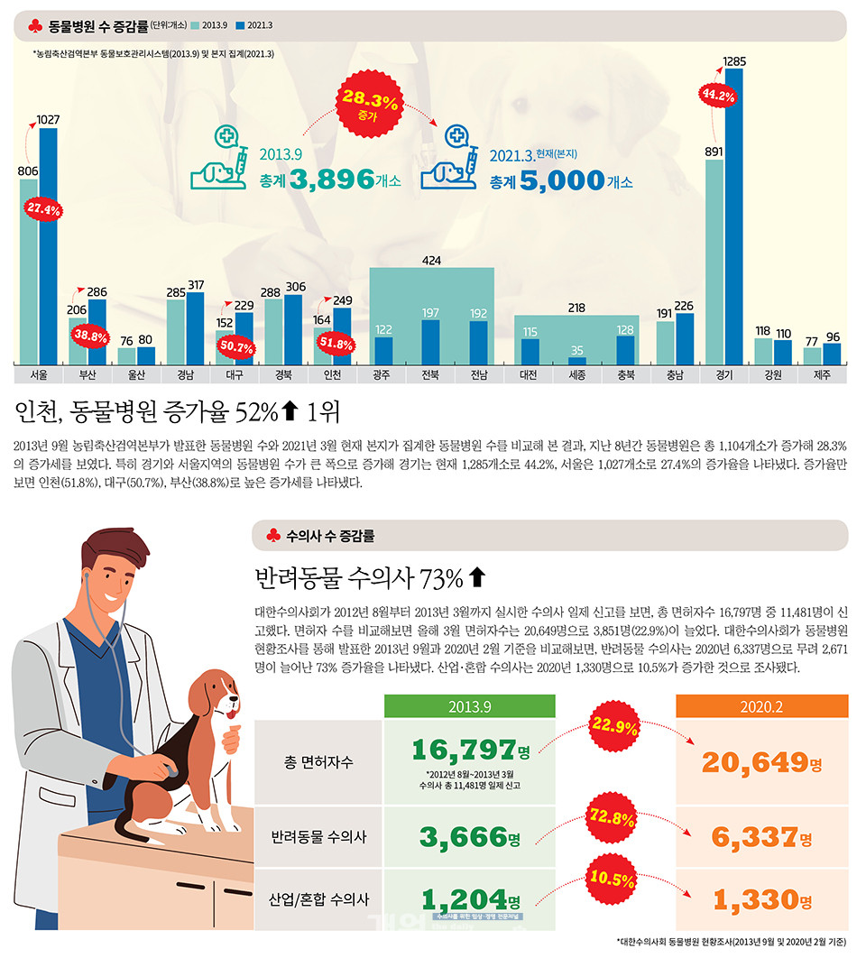 이번 200호 특집을 맞아 창간 당시 발표했던 자료와 2021년 현재 자료를 비교하면서 7년이 지난 지금 수의계는 얼만큼 성장하고 변화해 왔는지 그래픽을 통해 비교해봤다. <편집자주>