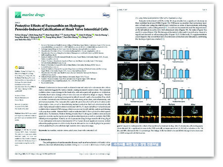 SCI급 해양의학분야 국제학술지 「Marine drugs」에 게재된 논문에서는 ‘후코잔틴의 심장판막간세포(VIC)에서의 산화적 손상에 의한 사멸 억제효과’에 대한 연구결과를 통해 심장판막간세포를 섬유화로부터 보호하는 데 있어 후코잔틴의 직접적인 메커니즘를 입증했다.