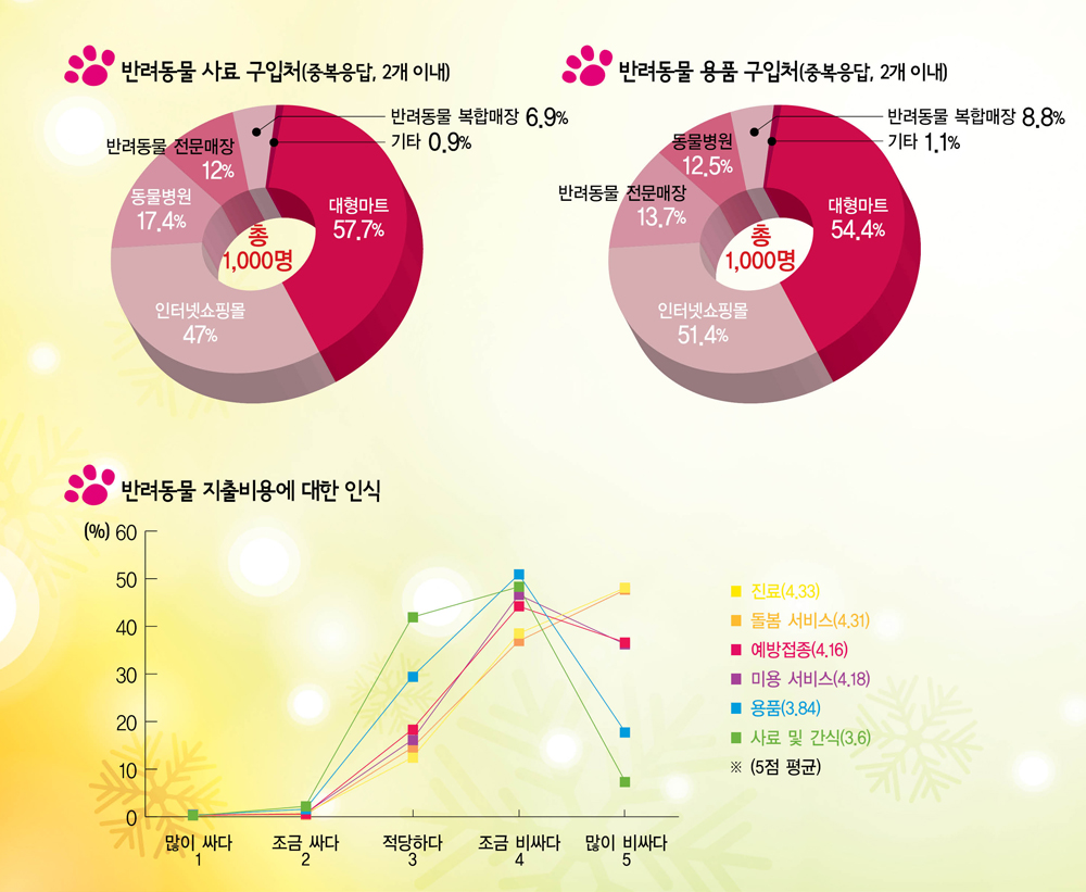 한국소비자원이 2012년부터 2013년 7월 중순까지 조사대상자(1,000명) 중 동물 사료 및 간식 구입처를 설문한 결과, 60%에 가까운 반려인들이 대형마트(57.7%)를 가장 많이 이용하는 것으로 나타났다. 그 다음으로 인터넷 쇼핑몰(47%), 동물병원(17.4%), 반려동물 전문매장(12%) 순으로 동물병원 구입은 18%도 못 미치는 수준이었다. 반려동물 용품 구입 역시 대형마트(54.4%)가 가장 많았고, 인터넷 쇼핑몰(51.4%), 반려동물 전문매장(13.7%), 동물병원(12.5%) 순으로 용품은 대형마트과 쇼핑몰에서 대부분 구입하는 것으로 조사됐다.