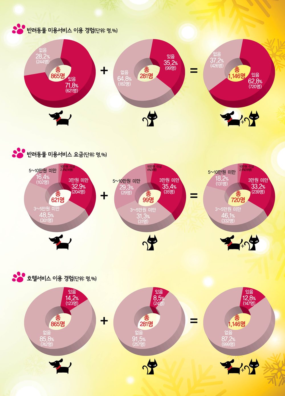 호텔서비스(돌봄서비스)을 이용한 경험이 있는 경우는 조사대상자(1,146명) 중 12.8%에 불과했으며, 강아지는 14.2%, 고양이는 8.5%로 나타났다. 또한 안락사를 포함해 반려동물이 죽어 사후처리를 한 경험이 있는 경우는 조사대상자(1,000명) 중 27.1%에 불과했는데, 사후처리 방식은 ‘땅에 묻은 경우’(66.1%)가 가장 많았고, 동물병원 의뢰(22.9%), 납골당 안치(8.6%), 화장(1.5%) 등이었다.