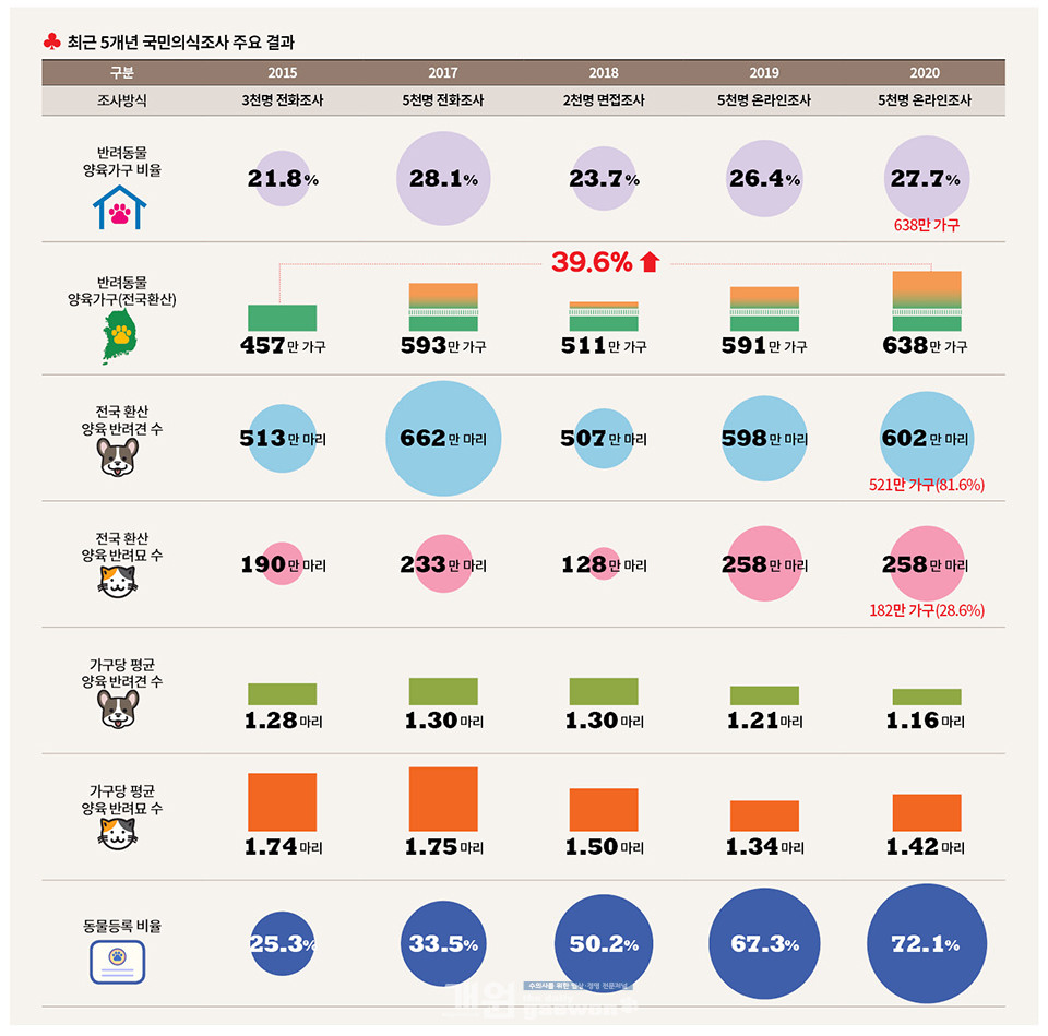 반려견은 2020년 521만 가구에서 602만 마리(81.6%)를, 반려묘는 182만 가구에서 258만 마리(28.6%)를 기르는 것으로 조사됐다.