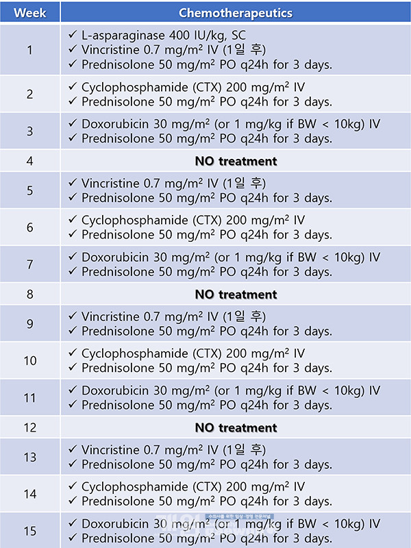 백혈구 수치는 보통 3,000cells/ul, 호중구 수치는 2,000cells/ul 이상이면 항암치료가 가능하다. 혈액검사에서 이상이 없어서 L-asparaginase를 피하주사하였다. 항암제 투여 전부터 수액을 투여하였고, 전처치 약물로 dexamethasone, chlorpheniramine, maropitant, cefazoline을 투여하였다.