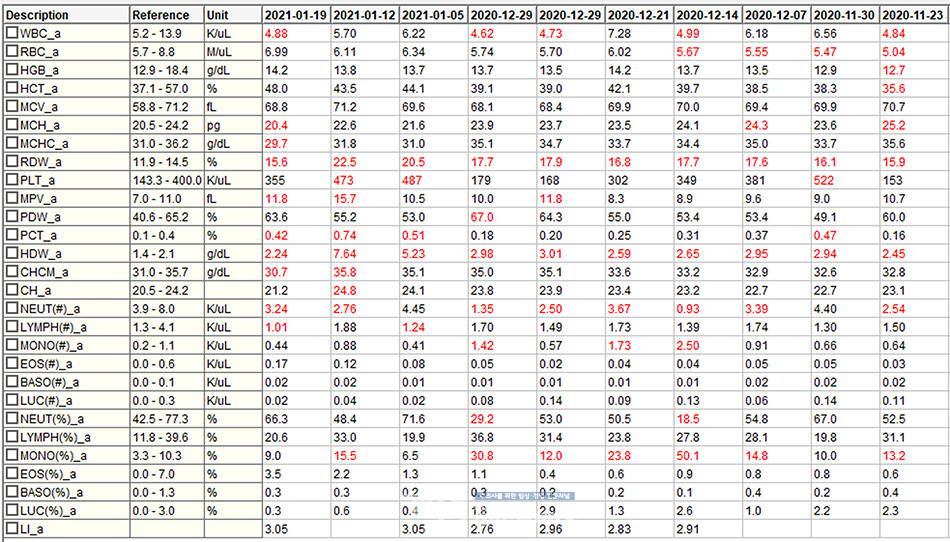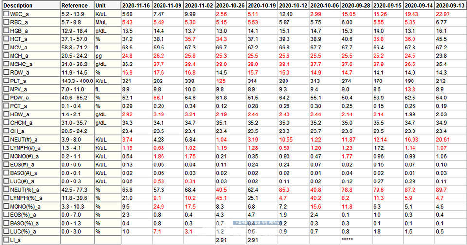 5주차인 11월 2일의 혈액검사에서 백혈구수는 9,990cells/ul, 호중구수는 6,840cells/ul로 증가하였다. 백혈구 감소증이 있다고 G-CSF와 같은 약물을 사용하지 않아도 백혈구수는 정상으로 회복했다.
