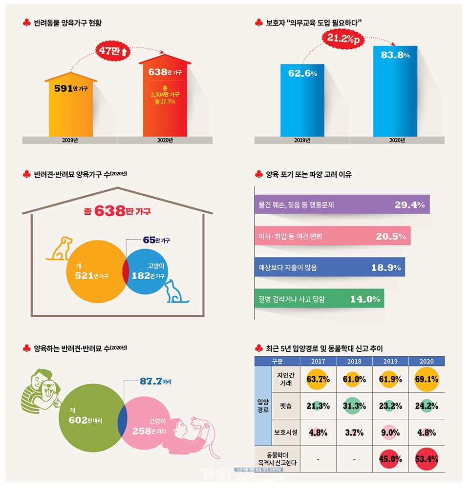 보호자 의무교육 도입에 대해서도 ‘필요하다’고 답한 보호자들이 83.8%로 전년(62.6%) 대비 큰 폭(21.2%p)으로 상승했다. 양육 포기 또는 파양 고려 이유로는 ‘행동문제’가 29.4%로 가장 많았다. <편집자주>