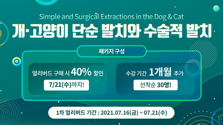 이번에 출시하는 강의는 ‘개‧고양이 단순 발치와 수술적 발치’ 총 8강으로 구성된 패키지로 다양한 발치 사례를 중심으로 진행되는데, 강의내용은 다음과 같다. △송곳니 발치 △큰어금니 발치 △작은어금니 발치 △전악 발치 △분악 발치 △간단하게 뽑는 Case △도구를 써서 뽑는 Case.