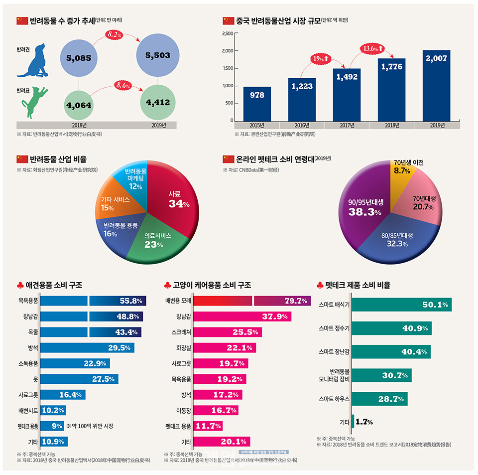 쳰짠산업연구원(前瞻产业研究院) 자료에서는 2017년 반려동물 관련 시장 규모가 1,492억 위안, 2018년 1,776억 위안으로 각각 전년대비 약 19%, 13.6%씩 성장했고, 2019년에는 2,007억 위안 규모를 형성할 것으로 전망했다.
