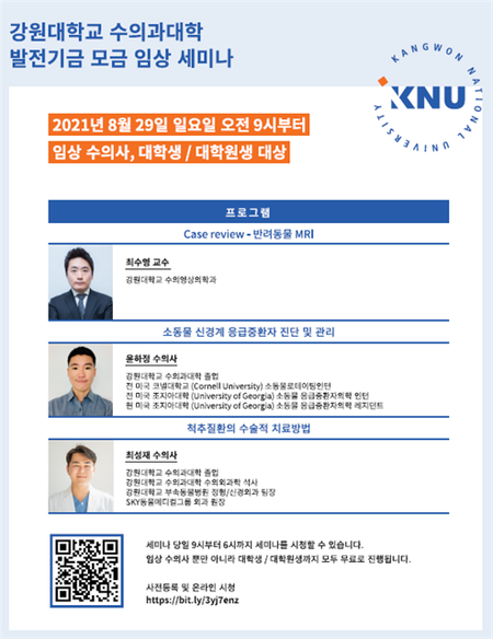 강원대학교 수의과대학(학장 김현철)이 8월 29일(일) ‘강원대학교 수의과대학 발전기금 모금 임상 세미나’를 온라인으로 진행할 예정이다.