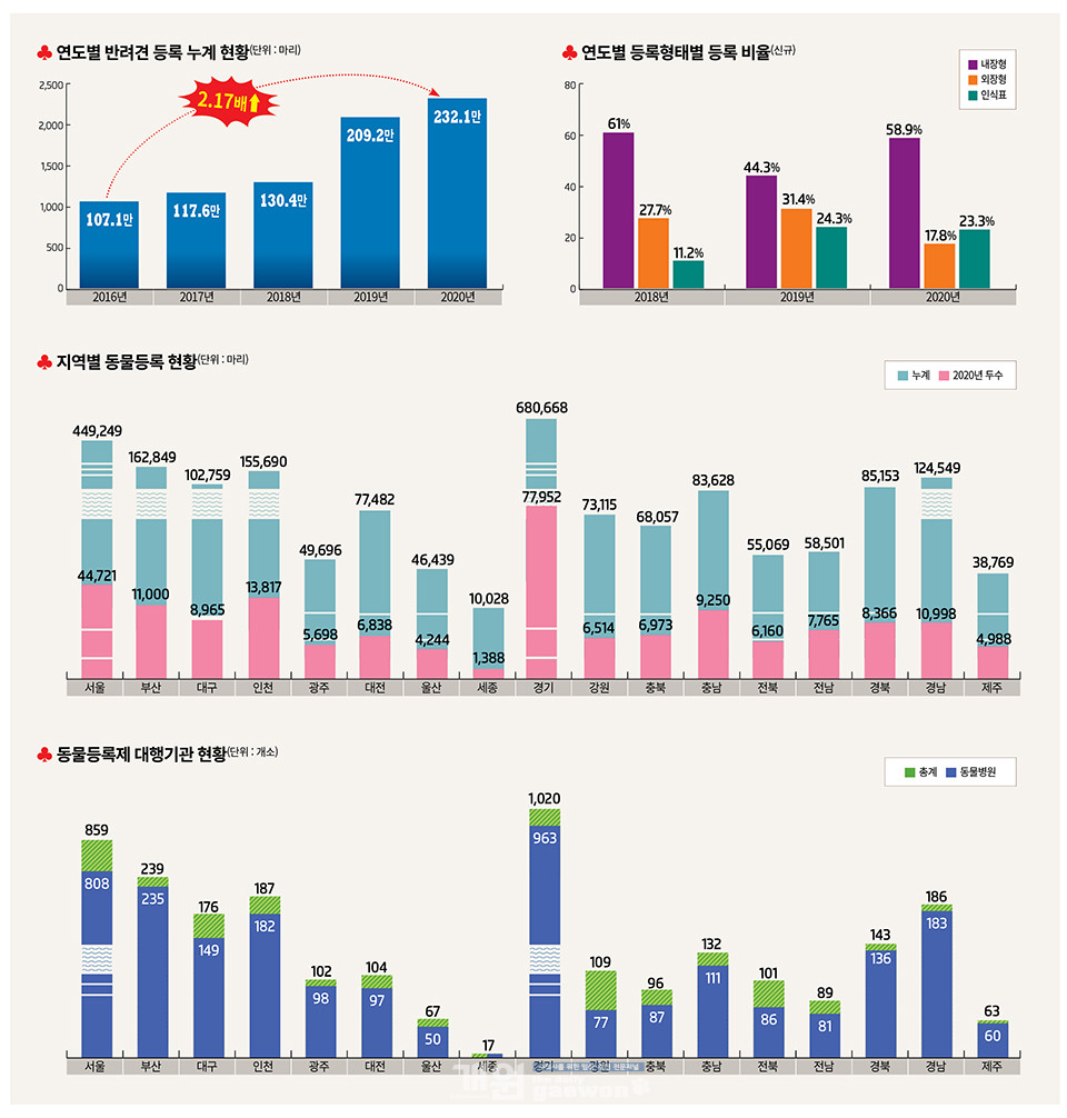 지역별로는 경기도 77,952마리(33%), 서울 44,721마리(19%), 인천 13,817마리(6%) 순으로 신규 등록했다. 연도별 누계 마릿수는 2016년 107.1만 마리에서 2017년 117.6만 마리, 2018년 130.4만 마리, 2019년 209.2만 마리, 2020년 232.1만 마리로 꾸준히 증가하며, 5년만에 2배 이상 증가했다.
