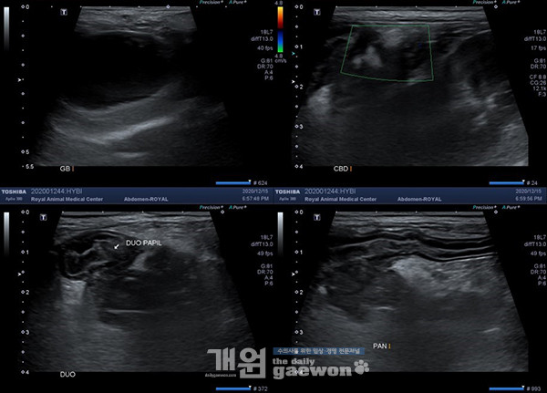 다음은 복부 초음파 사진입니다. 초음파 소견은 다음과 같습니다. 담낭의 심한 확장; 확장된 담낭 내 unechoic fluid 충만; 십이지장벽의 corrugation; 췌장 주변 지방의 심한 에코 상승; 췌장 주변 지방 조직 일부에서 unechoic cyst; duodenal papillae 개구부 주변 CBD의 확정 소견 관찰되지 않음; 담낭에서 십이지장까지 CBD의 추적이 어려우며, 주변 지방의 염증으로 인한 CBD의 허탈 상태 의심. GB dilation이 확진됩니다. 감별진단으로는 CBD obstruction(EHBO)/cholangitis, pancreatitis, duodenitis가 있습니다[그림 6].