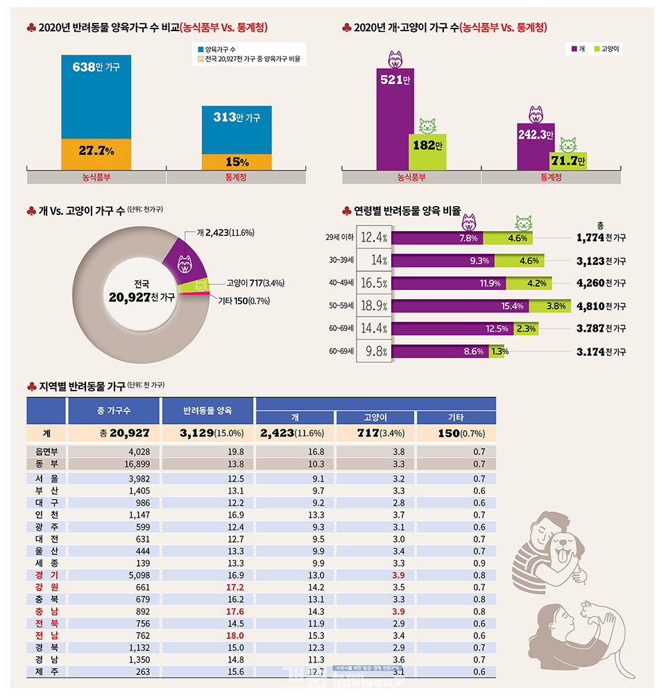 통계청이 발표한 ‘2020 인구주택총조사 표본 집계’ 결과, 국내 반려동물 양육가구 수는 313만으로 조사됐다. 이는 전국 2,092만7,000가구 중 약 15%에 해당하는 숫자로 농림축산식품부가 발표한 ‘2020 양육가구 수’ 638만 가구의 절반에 해당하는 수치다. 양육가구 비율도 농식품부 발표는 27.7%로 차이를 나타냈다.
