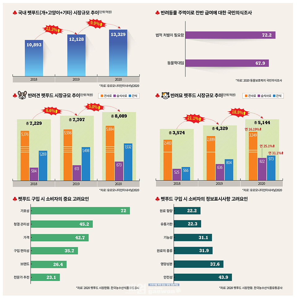 지난 10월 21일 진행된 ‘2021 반려동물 산업분야 규제혁신 포럼’에서 한국농촌경제연구원 이정민 박사가 발표한 자료에 따르면, 지난해 국내 펫푸드 시장 규모는 2018년 10,893억에서 2019년 12,128억, 2020년 13,329억으로 연평균 10.6%의 증가세를 나타냈다.