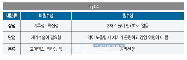 차단막의 종류 흡수성과 비흡수성의 비교 표[fig 04]입니다. 가장 큰 특징은 비흡수성은 제거 수술이 필요하다는 점입니다.