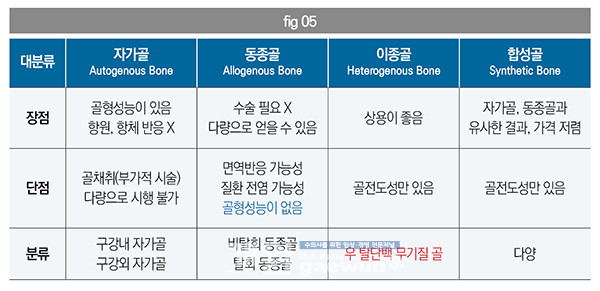 골이식재에 대한 비교 표[fig 05]입니다. 저희 병원에서 사용하는 재료는 우 탈단백 무기질골로 ‘이종골’에 속합니다.