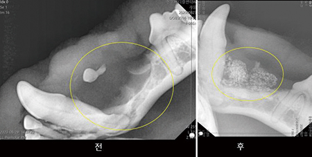 - 낭종부위 녹은 뼈의 재생이 보임[fig 06]
