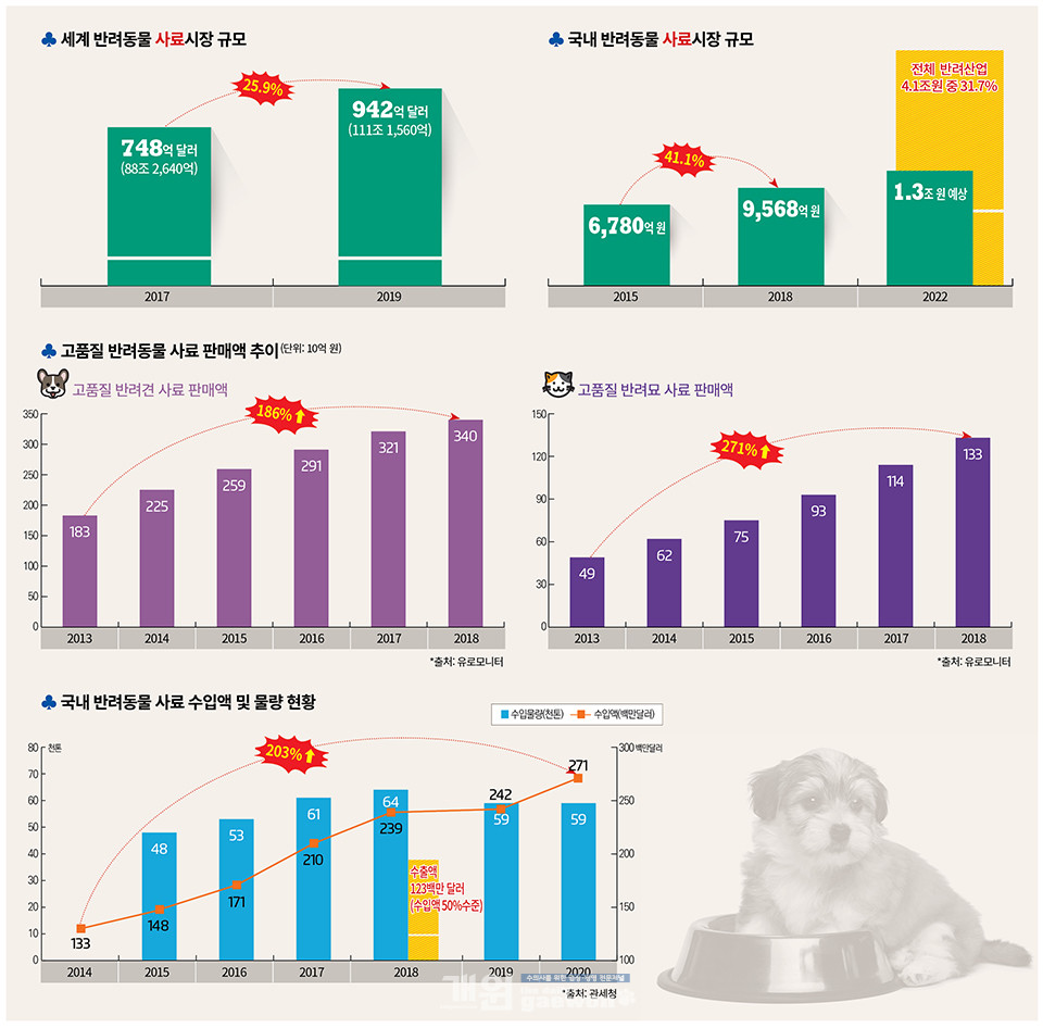 사료는 저렴한 국내 사료보다 식품과 같이 유기농, 기능성, 천연재료, 신선한 원료 등 고품질 원료를 사용한 외국산 사료를 선호해 고품질 반려동물 사료 소비가 급증하고 있다.