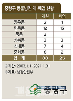서울시 중랑구는 2021년 1월 31일 기준 총 58개소가 개원하고, 이 중 43%가 폐업, 현재 33개소(57%)가 개원하고 있다.