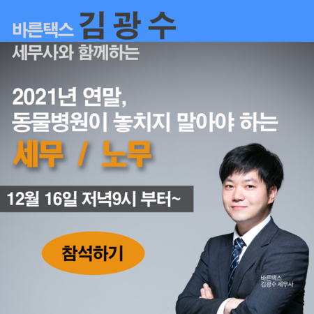 수의사 지식나눔 플랫폼 ‘벳채널(VETCHANNEL)’이 이번 주 12월 16일(목) 저녁 9시부터 ‘연말, 동물병원이 놓치지 말아야 하는 세무/노무’를 주제로 약 2시간에 걸쳐 실시간 웨비나를 진행한다.