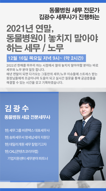 김광수 세무사는 “동물병원을 운영하는 많은 원장님들이 세무와 노무관련 부분에서 많은 스트레스를 받고 있다. 외부 업체에 모두 맡기면 좋겠지만, 금액에 대한 부분도 무시할 수 없다. 대형 병원이 아닌 이상 원장님 스스로 해결할 수밖에 없는 상황이다 보니 현직 세무사로서 안타까운 경우를 많이 접하게 된다”면서 “2시간이라는 짧은 시간이지만 이번 웨비나를 통해 그동안의 경험을 바탕으로 최대한 많은 도움을 드리고 싶다”고 밝혔다.