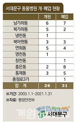 홍은동은 서대문구에서 폐업율이 가장 높은 지역이다. 첫 개원이 이뤄진 1996년부터 지난해 1월 31일까지 총 10개소의 동물병원이 개원해 그 중 80%(8개소)가 폐업했을 정도다.