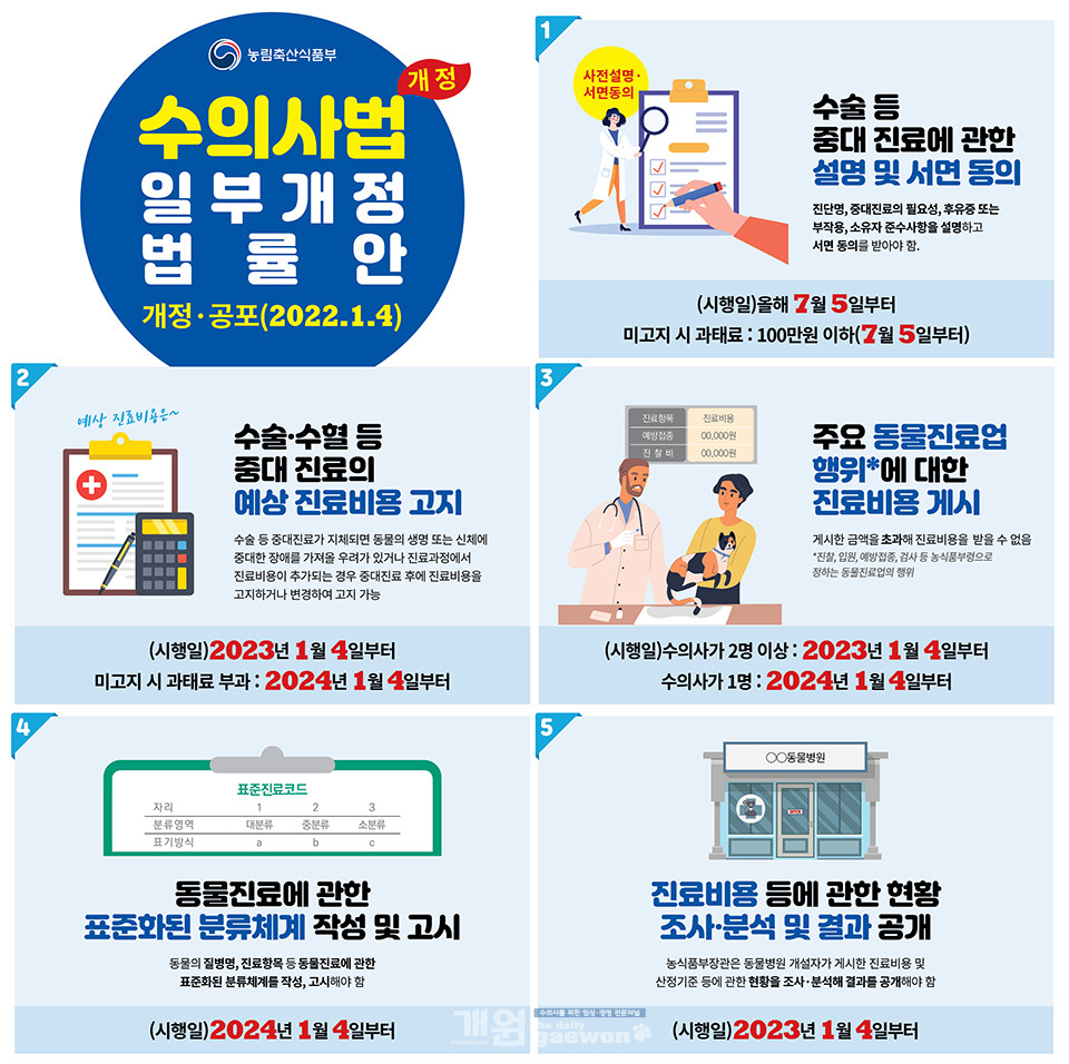 농림축산식품부가 수의사법 일부 개정법률안을 1월 4일 공포함에 따라 진료비 사전고지와 중대진료의 설명 및 서면 동의를 비롯해 예상 진료비용 고지가 의무화 된다. 다만 시행일은 공포 후 6개월부터 2년까지 항목에 따라 차이가 있다.