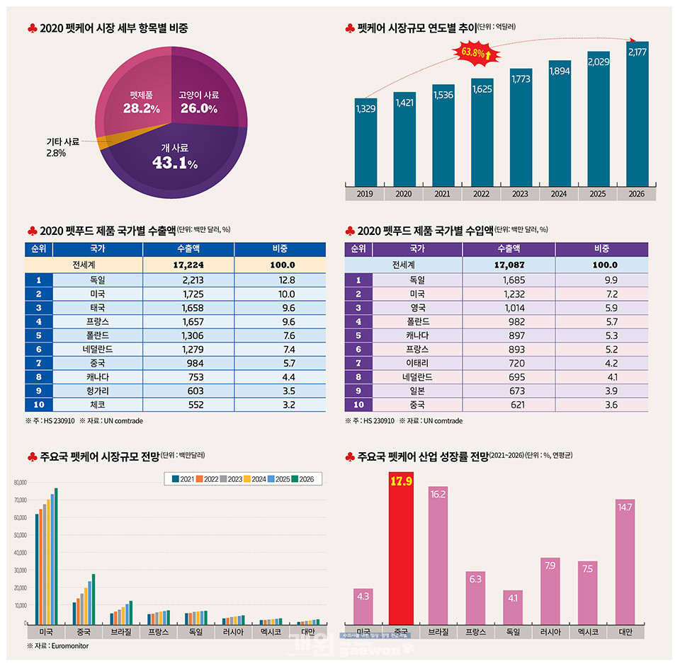 한국무역협회 국제무역통상연구원이 발행한 ‘Trade Focus 2022년 1호’에서 발표한 ‘성장하는 펫케어 산업 최신 트렌드와 우리 기업의 글로벌 경쟁력 강화 방안’에 따르면, 2020년 글로벌 펫케어 시장은 전년대비 6.9% 성장한 1,421억 달러로 2026년에는 2,177억 달러에 이를 것으로 전망했다.