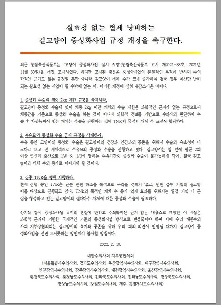협의회는 “현행 중성화사업은 TNR의 본질적 목적에 반하고, 수의학적 근거가 부족하다. 결과적으로 예산만 낭비하는 실효성 없는 사업으로 전락했다”며 “과학적 근거에 기반한 TNR 규정으로 개선되어야 한다”고 피력했다.