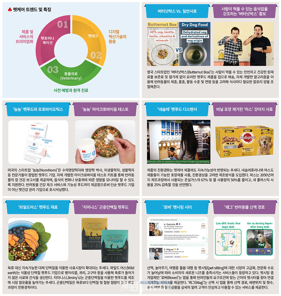 한국무역협회 국제무역통상연구원이 발행한 ‘Trade Focus(2022년 1호)’에 따르면, 반려동물을 사람처럼 대하는 ‘펫휴머니제이션’과 디지털 혁신기술을 제품에 적용시킨 ‘펫테크’, 반려동물의 질병을 예방하고 원격치료를 가능하게 하는 ‘첨단 동물의료(veterinary)’ 키워드가 펫시장 트렌드를 주도하고 있다.