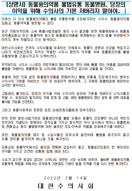 대한수의사회(회장 허주형, 이하 대수회)가 “더 이상 동물용의약품의 불법 유통행위를 조장․방조하는 수의사, 동물용의약품 도매상, 동물약국을 방관할 수 없다”며 성명서를 내고, 불법행위를 조장하는 수의사와 동물약품도배상 및 동물약국에 강력한 대응 입장을 밝히며 경고했다.