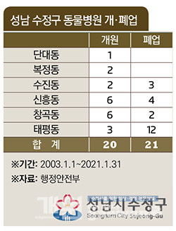 경기도 성남시의 구시가지인 수정구는 90년대부터 동물병원이 개원하기 시작해 2000년대 들어 개원이 활발해지면서 폐업도 늘었다.