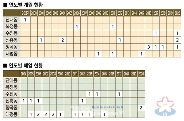 수정구에서는 태평동이 가장 많은 15개소가 개원했지만, 이 중 12개소가 폐업하고 현재는 3개소만 운영하고 있어 개원 성공률은 20%에 그친다.