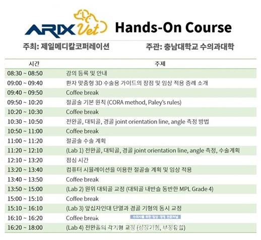 오는 4월 23일(토) 서울 구로구에 위치한 제일메디칼 본사에서 원데이로 진행되는 이번 핸즈온 코스는 ‘환자 맞춤형 3D 수술가이드를 이용한 뼈기형 교정법’을 주제로 이해범(충남대 수의과대학 정형·신경외과) 교수 등이 강의와 실습을 진행할 예정이다.