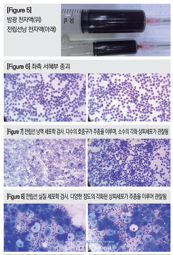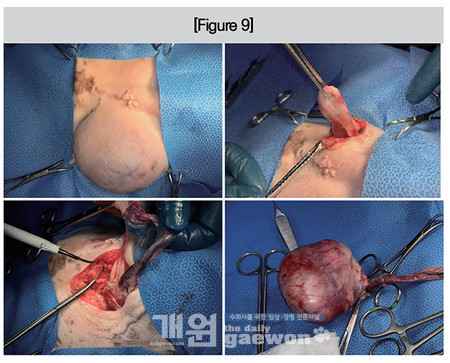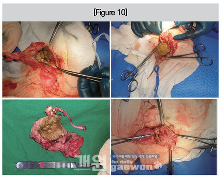 치료 과정 중 우측 서혜부 잠복고환 및 종양화된 좌측 서혜부 세르톨리 세포종은 절제하였다[Figure 9]. 이어서 전립선 농양은 수술적 교정(Partial resection, drainage and omentalization) 하였다[Figure 10].