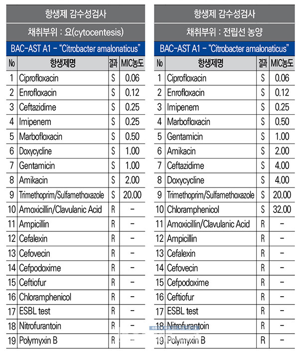 각천자액은 세균배양검사 의뢰하였으며, 동일하게 Citrobacter amalonaticus가 배양되었다.