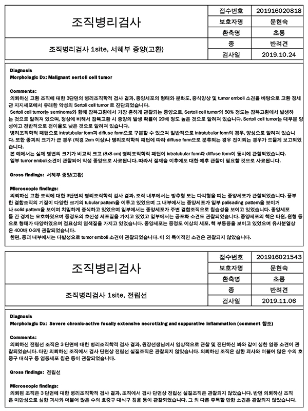 추후 Sertoli cell tumor로발생한 Hyperestrogenism에 의한 전신 탈모는 6개월 후 완전히 개선 되었으며, 주증이었던 핍뇨도 현저히 개선되었다.