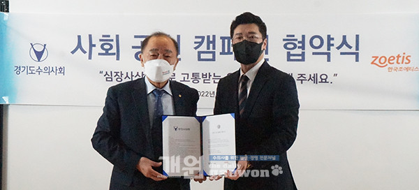 경기도수의사회(회장 이성식)와 한국조에티스(주)(대표 이성기)가 지난 3월 22일 ‘사회 공헌 캠페인’ 협약식을 갖고, 심장사상충으로부터 고통 받는 유기견들의 진단, 치료, 예방 활동을 위한 ‘SNS 챌린지’를 공동으로 개최하기로 했다.