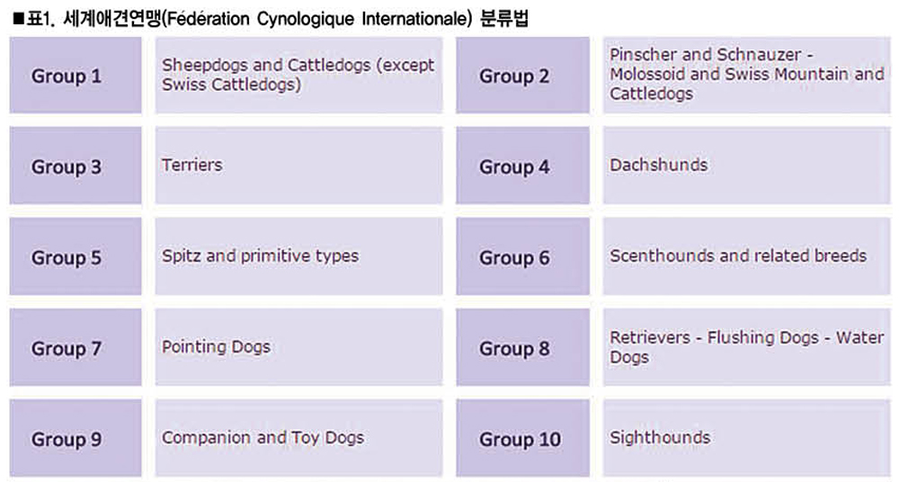 인위적인 교배를 통해 특정 임무를 수행할 수 있는 품종들을 개량하게 되었으며, 현존하는 다양한 품종 분류법이 그러한 임무별로 이뤄지고 있다. 그 예로 세계애견연맹의 분류법을 들여다보자<표1 참조>.