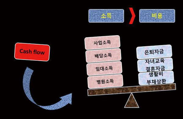 아래 그림처럼 다양한 현금흐름 시스템을 구축해 놓게 되면 직업을 통한 수입에 대한 의존도가 적어지게 될 것이다. 이것은 또한 행복한 은퇴를 준비하는 과정이기도 하다.