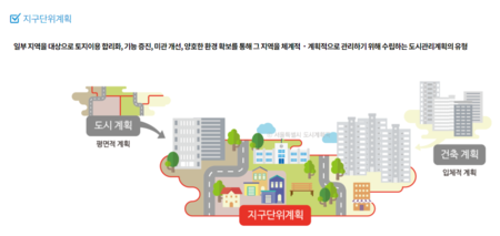 역세권이나 재개발재건축 구역 등 주요 부지의 건축물 용도와 용적률, 건폐율, 높이 등을 정한 도시관리계획으로서 지구단위계획구역으로 지정된 곳은 대통령령으로 정해져 다른 법령보다 훨씬 더 힘이 세 용도 변경이 불가능하다.