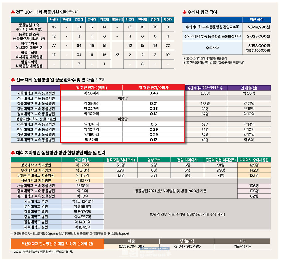 수의미래연구소(공동대표 조영광·허승훈, 이하 수미연)가 사립대인 건국대를 제외한 9개 대학 동물병원 및 수의과대학에 대한 정보를 교육부 정보공개청구(open.go.kr)를 통해 확인한 결과, 교수 포함 수의사 수는 서울대가 42명으로 가장 많았으며, 강원대, 경북대 순으로 나타났다.