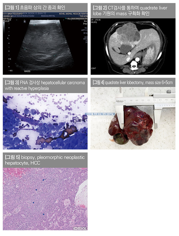 CT 결과, quadrate liver lobe 기원의 mass로 크기는 6×5cm 정도의 massive form 이였으며, 담낭벽과 심하게 유착 가능성이 있었다. 수술적으로 quadrate liver lobectomy, cholecystectomy를 진행하였고, 조직검사로 최종적으로 hepatocellular carcinoma로 진단되었다. 항암치료 등은 보호자가 원치 않아서 진행하지 않았다.