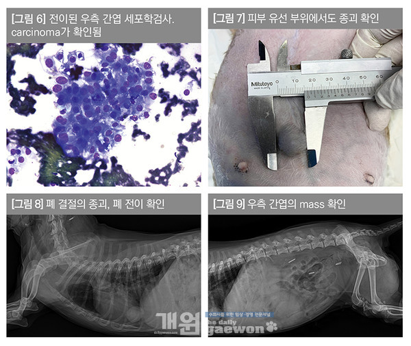 내재질환을 고려할 때 종양 전이가 강하게 의심되는 상황이었다. FNA 검사에서도 동일하게 피부 유선과 복강안의 종괴 모두 HCC로 진단되었다. 전이를 확인한 후 보호자는 sorafenib와 piroxicam 적용에 동의하여 투약을 시작하였다.