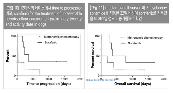 표적 치료제로서의 sorafenib는 상피성 기원의 carinoma, 특히 HCC에서 적용해 생존율을 높여서 기존의 항암 처치 이외의 대안적인 치료 옵션이 될 수 있다. 또한 sorafenib가 osteosarcoma, hemangiosarcoma 등에서도 치료효과가 있다는 보고가 있으므로 적용하여 효과 및 부작용에 대한 논의가 필요할 것으로 보인다. <完>