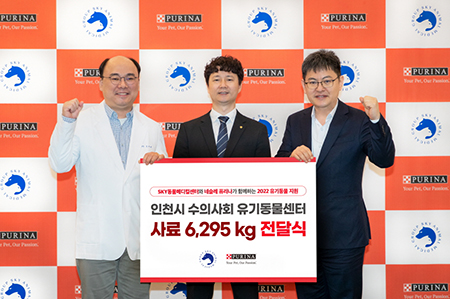 이날 사료 증정식에는 네슬레퓨리나와 SKY동물메디컬센터, 인천지부 유기동물센터 보호소 관계자가 참석해 유기동물들에 대한 인식 개선과 성숙한 반려동물 문화 조성을 위해 노력하자는데 뜻을 모았다.