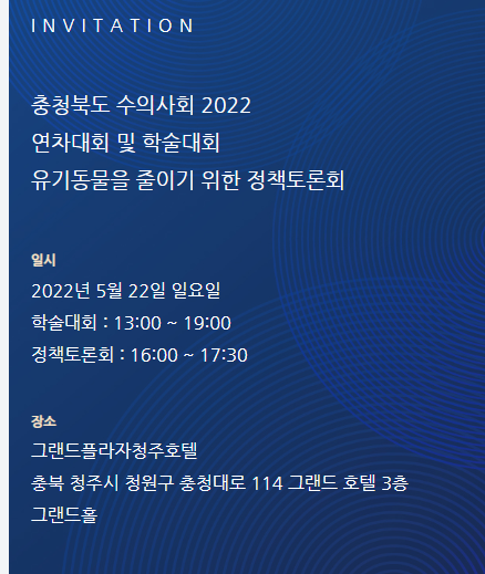 충청북도수의사회(회장 이승근, 이하 충북지부)의 ‘2022 연차대회 및 학술대회’가 5월 22일(일) 오후 1시부터 7시까지 그랜드플라자청주호텔에서 개최된다.