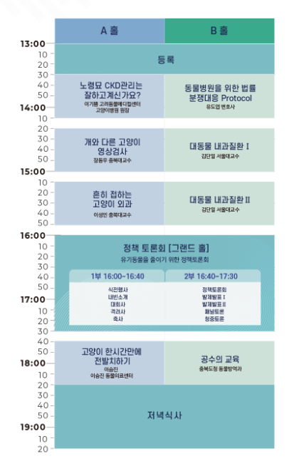 A홀에서는 먼저 이기쁨(고려동물메디컬센터 고양이병원) 원장이 ‘노령묘 CKD 관리는 잘하고 계신가요?’를 연제로 노령묘의 만성신장질환 관리법을 설명하고, 장동우(충북대 수의영상의학교실) 교수가 ‘개와 다른 고양이 영상검사’를, 이성인(충북대 수의외과학교실) 교수가 ‘흔히 접하는 고양이 외과’에 대해, 이승진(이승진동물의료센터) 원장이 ‘고양이 한시간만에 전발치하기’를 강의할 예정이다.