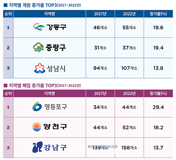 인근 분당구, 중원구도 낙수효과를 톡톡히 누리면서 2017년 총 94개소가 개원 중이던 성남시는 현재 총 107개소가 개원을 유지 중이다.